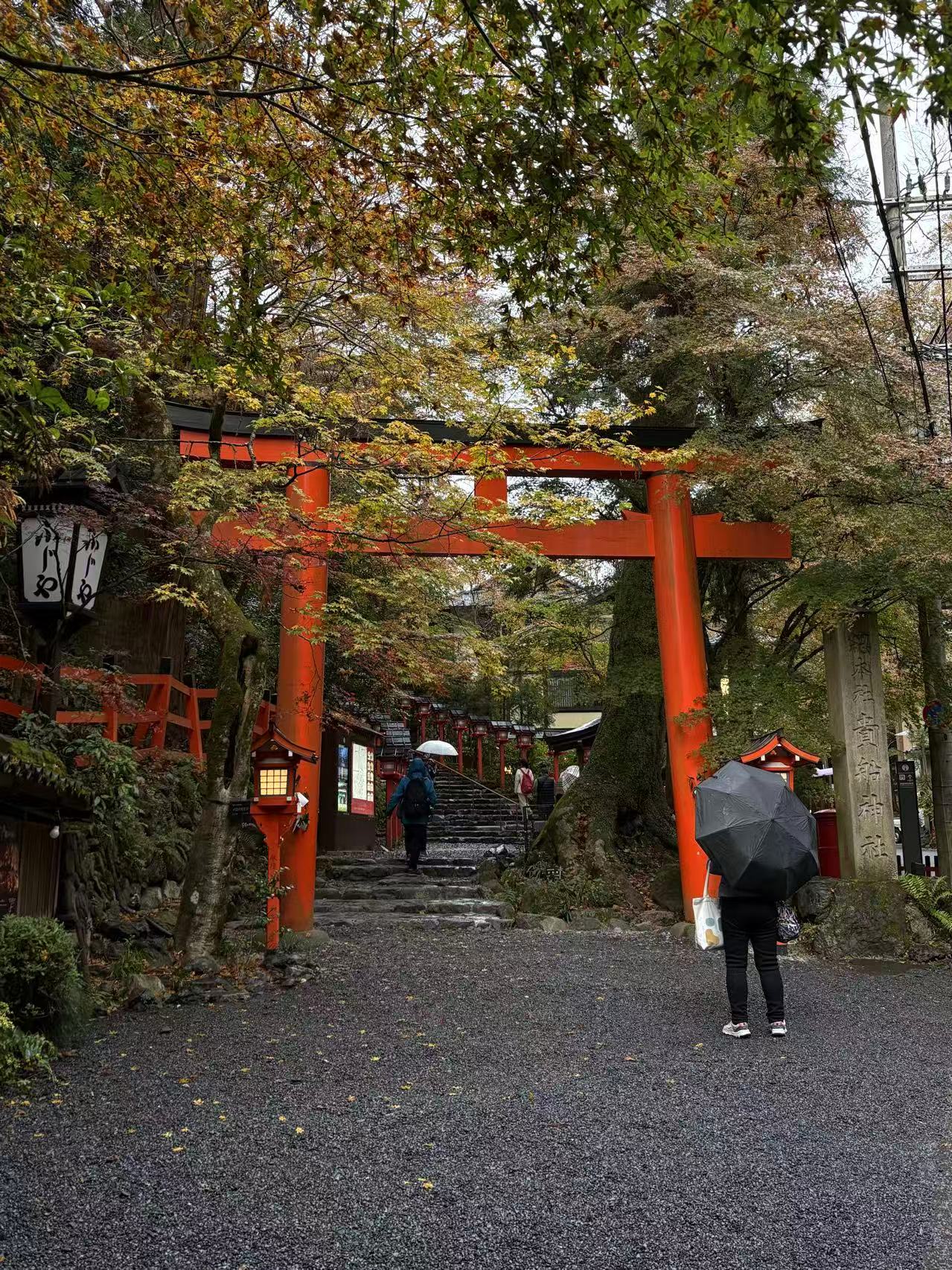 雨天固然有氛围,但这个石板路很滑,上下楼需要小心,大家都走得格外慢。贵船神社一共分为「本宮」「奥宫」「結社」三座社,据说依序参拜所有社殿就可以实现愿望。很不幸我们是回来后才知道,当天由于到达本宫后雨越下越大,且冷得有点受不住(没有带秋裤的坏处)我们只逛完本宫,在亭子里躲了会雨就返程了。