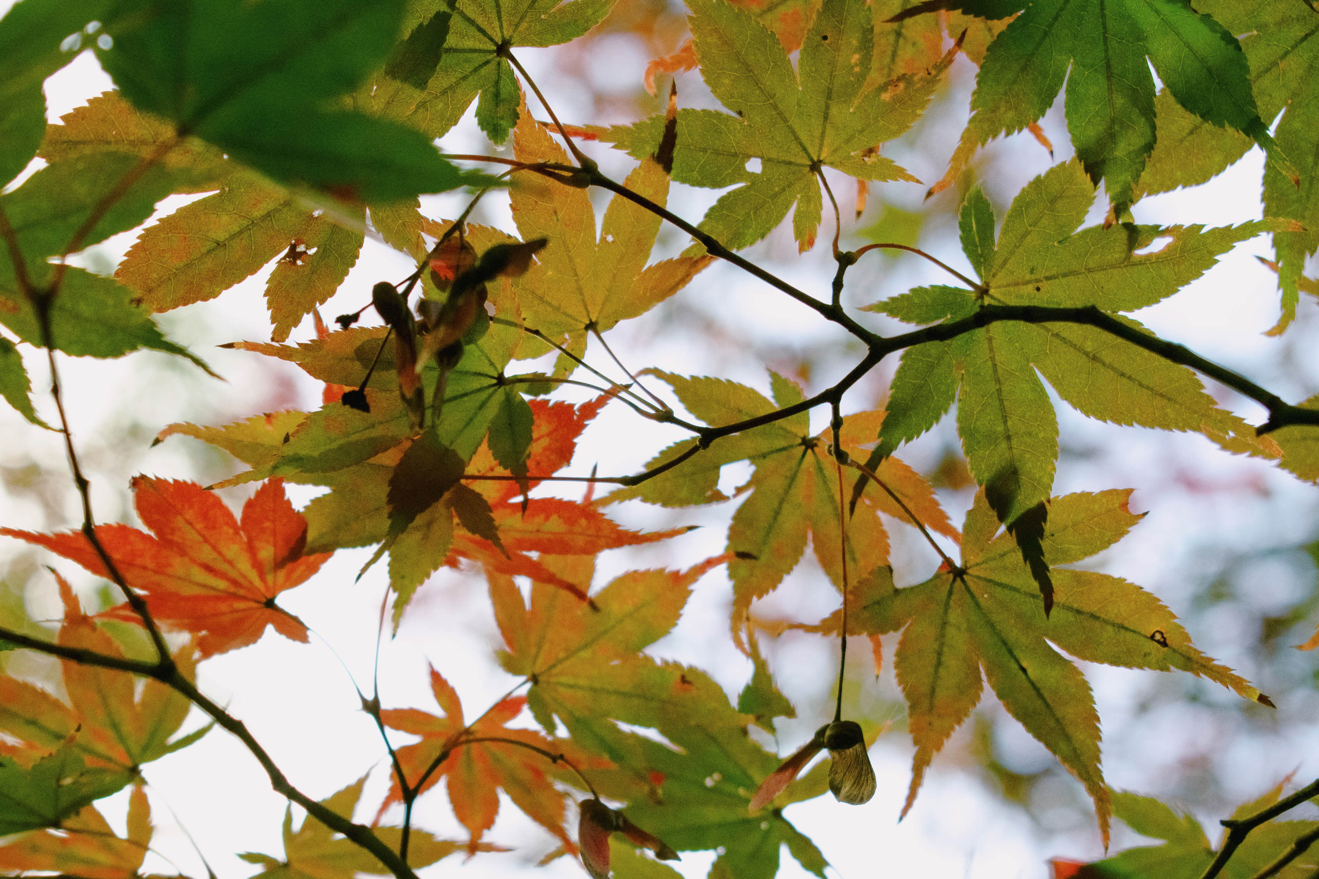 从这里看枫叶还只有点点红,转身走进庭院就看到了一整片的红枫,这也是我们在京都感受到最完整的一片红枫。有朋友也在红枫季来过,但她来的时候其他地方枫叶正红,天授庵的都已经黑掉了。回来后搜索了一下,似乎是因为特意选种了早期变色的枫树品种,加上是一个包围式的庭院和池泉回游式庭园,能提供更理想的枫叶环境所以会先红。