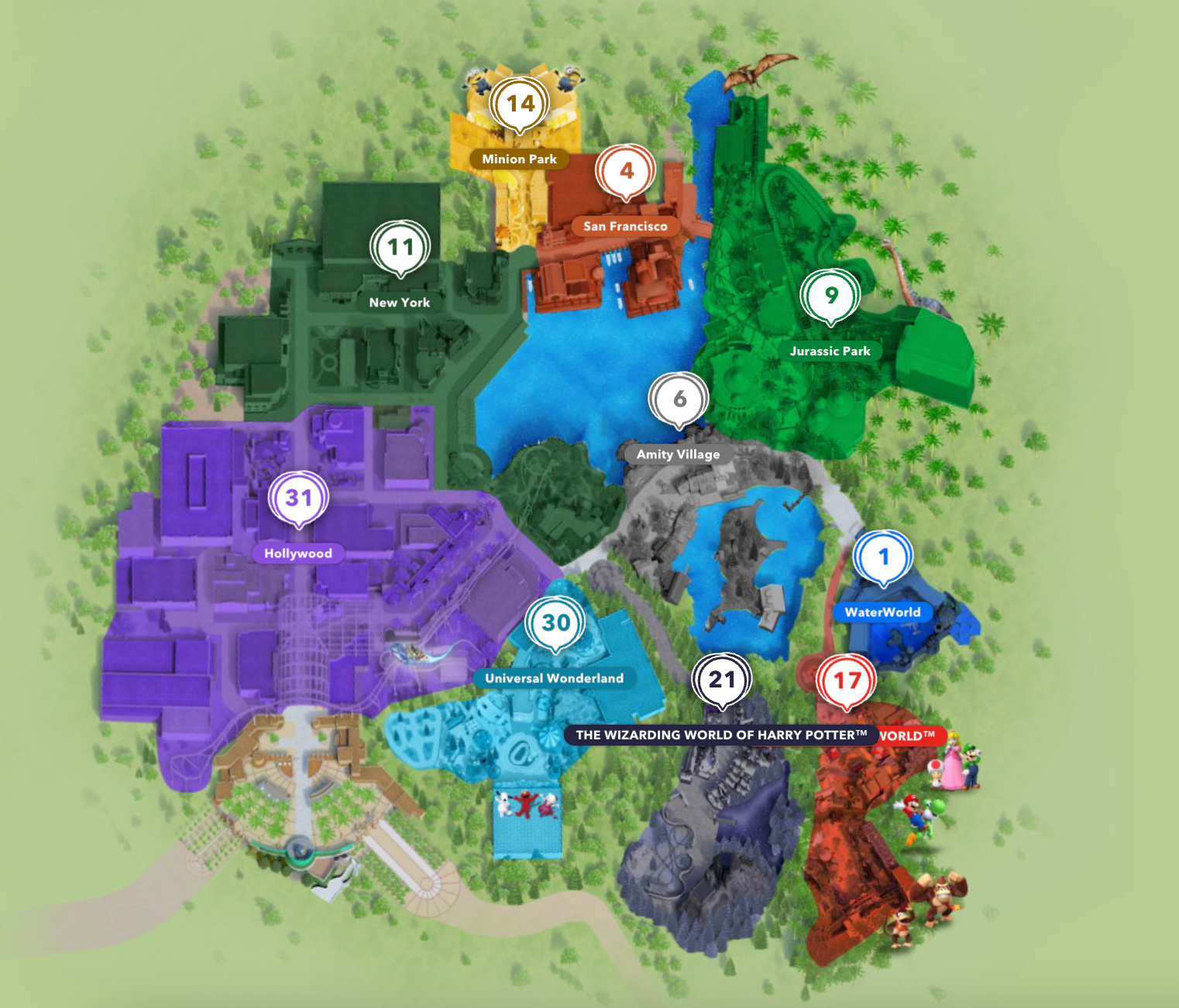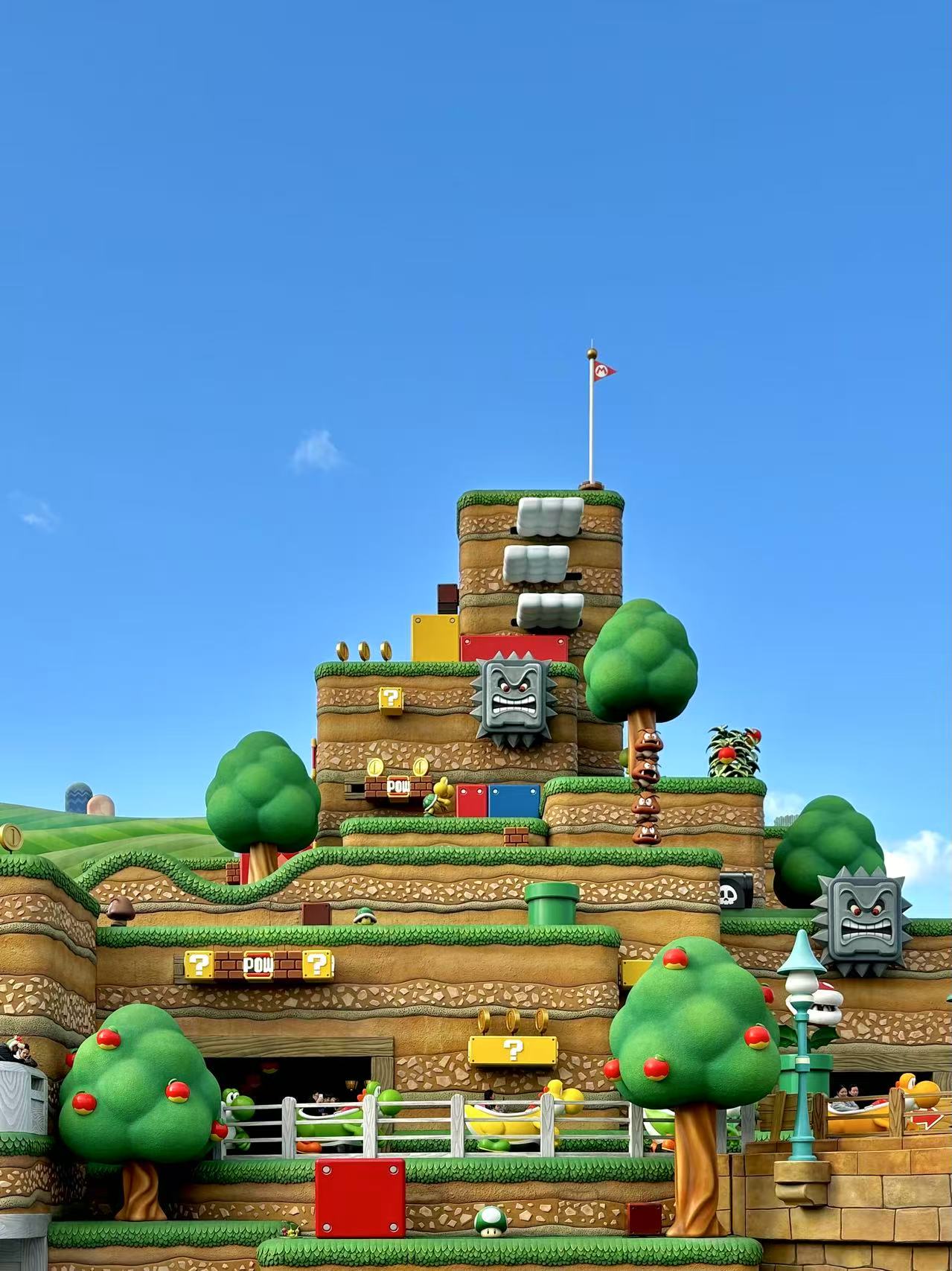 结束后距离我们任天堂入园时间很近,走过去刚刚好,门口工作人员验码后还会和你互动大喊「Here we go!」当天是一个大晴天,穿过水管看到了完美还原的任天堂世界,当然还有下面密密麻麻的人。我们入园时还在庆幸当天没有特别多人,原来都来任天堂了。购买手环还可以在园区体验很多小游戏,不想花钱买的可以海鲜市场租赁,选择入园处交易。
