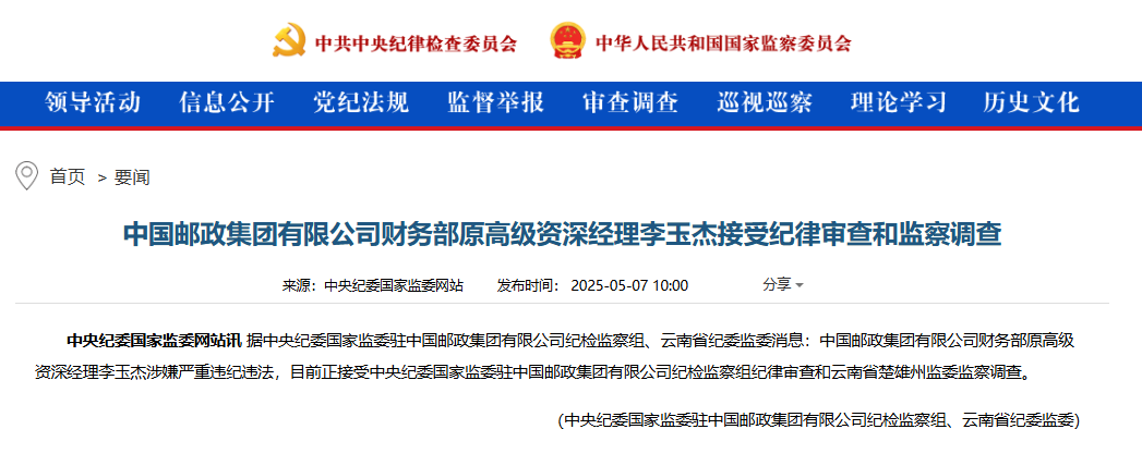5月7日,中央纪委国家监委网站发布消息,据中央纪委国家监委驻中国邮政集团有限公司纪检监察组、云南省纪委监委消息,中国邮政集团有限公司财务部原高级资深经理李玉杰涉嫌严重违纪违法,目前正接受中央纪委国家监委驻中国邮政集团有限公司纪检监察组纪律审查和云南省楚雄州监委监察调查。